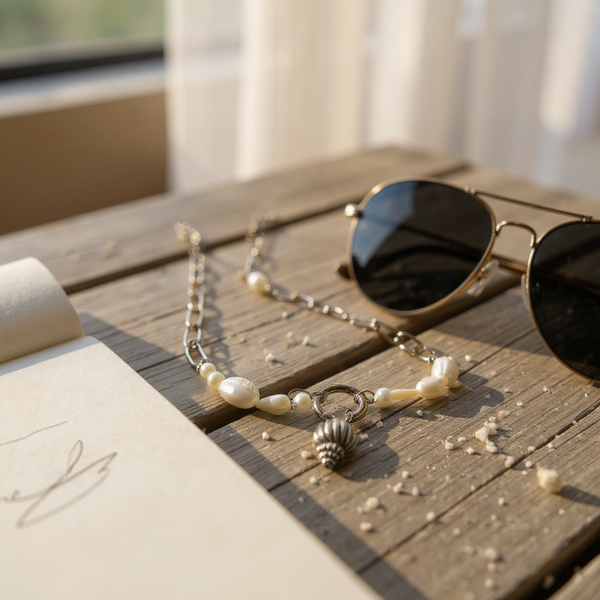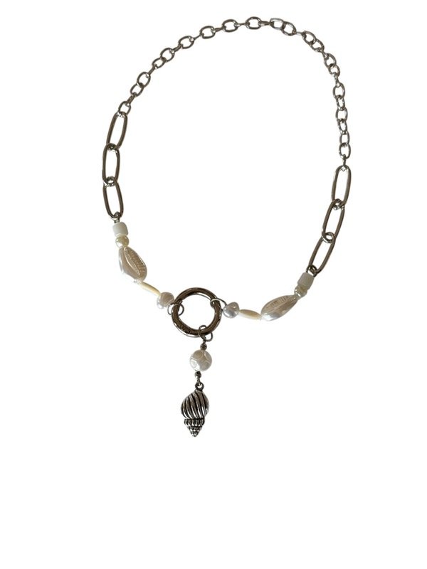 Collar inspirado en el mar, confeccionado con una delicada combinación de cadena metálica de eslabones grandes, cuentas perladas y caracoles naturales. En el centro, un dije metálico en forma de caracol aporta un detalle elegante y sofisticado. Ideal para quienes buscan un accesorio fresco y versátil, que complemente tanto looks de playa como atuendos urbanos con un toque chic y moderno.