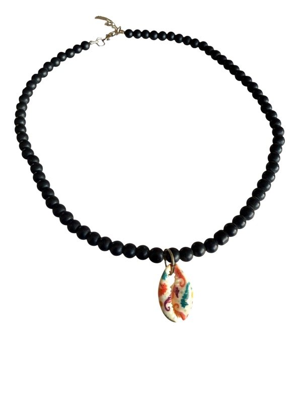 Collar artesanal elaborado con perlas negras mate, que aportan un estilo elegante y moderno. En el centro, un dije de caracol pintado a mano con detalles marinos en tonos vibrantes —caballitos de mar, estrellas y motivos oceánicos— que evocan la frescura y la energía del mar.